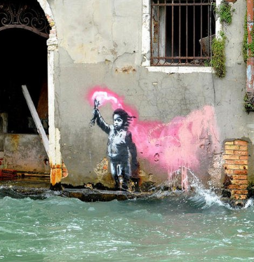 «The Shipwrecked Child » (L’enfant naufragé), Banksy réalise en mai 2019, à Venise, ce pochoir d’un enfant migrant portant un gilet de sauvetage et tenant une fusée de détresse allumée, sur le mur extérieur d'une maison dans le quartier du Dorsoduro. Il aborde une nouvelle fois la question de la crise mondiale des réfugiés, et dénonce cette fois-ci la situation désespérée des réfugiés, et en particulier, celle de ceux qui tentent la traversée de la Méditerranée, en bateau, au péril de leur vie. [©Marco SABADIN/AFP]