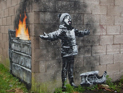 «Season's Greetings» (Joyeuses Fêtes), baptisé par Bansky, apparaît en décembre 2018, sur les murs formant l'angle d'un garage situé dans un quartier résidentiel et à proximité d'une aciérie, dans la ville industrielle galloise de Port Talbot, au Royaume-Uni. Cette œuvre représente un enfant debout à côté d'une luge, bras ouverts, qui tire la langue pour attraper des flocons de neige. Mais ceux-ci sont en fait de la cendre rejetée par une poubelle en feu dessinée sur le mur perpendiculaire. Beaucoup voient dans ce graffiti, le premier au Pays de Galles, une dénonciation de la pollution de l'air. [©BANKSY]